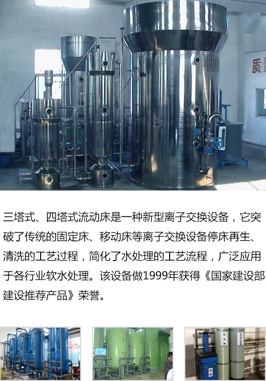 三塔式、四塔式流動床是一種新型離子交換設備,它突破了傳統(tǒng)的固定床、移動床等離子交換設備停床再生、清洗的工藝過程,簡化了水處理的工藝流程,廣泛應用于各行業(yè)軟水處理。該設備做1999年獲得《國家建設部建設推薦產品》榮譽。