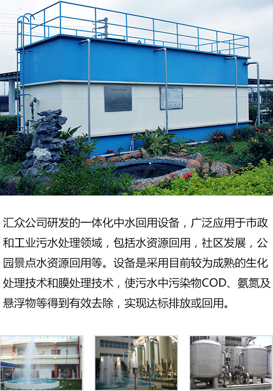 匯眾公司研發(fā)的一體化中水回用設備,廣泛應用于市政和工業(yè)污水處理領域,包括水資源回用,社區(qū)發(fā)展,公園景點水資源回用等。設備是采用目前較為成熟的生化處理技術和膜處理技術,使污水中污染物COD、氨氮及懸浮物等得到有效去除,實現(xiàn)達標排放或回用。